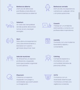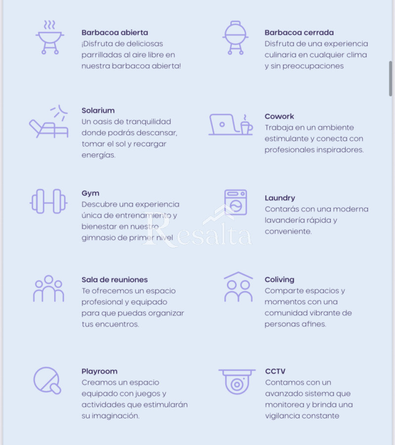 El edificio ofrece una amplia variedad de amenidades que garantizan confort, bienestar y una experiencia de vida integral. Entre ellas se destacan la barbacoa abierta y cerrada, ideales para disfrutar de reuniones en cualquier clima; solarium, perfecto para descansar y recargar energías; gimnasio de primer nivel; espacios de cowork diseñados para un entorno laboral inspirador; lavandería moderna y funcional; sala de reuniones equipada; áreas de coliving que fomentan la comunidad; playroom con actividades recreativas; y un sistema de seguridad con CCTV que brinda tranquilidad permanente.