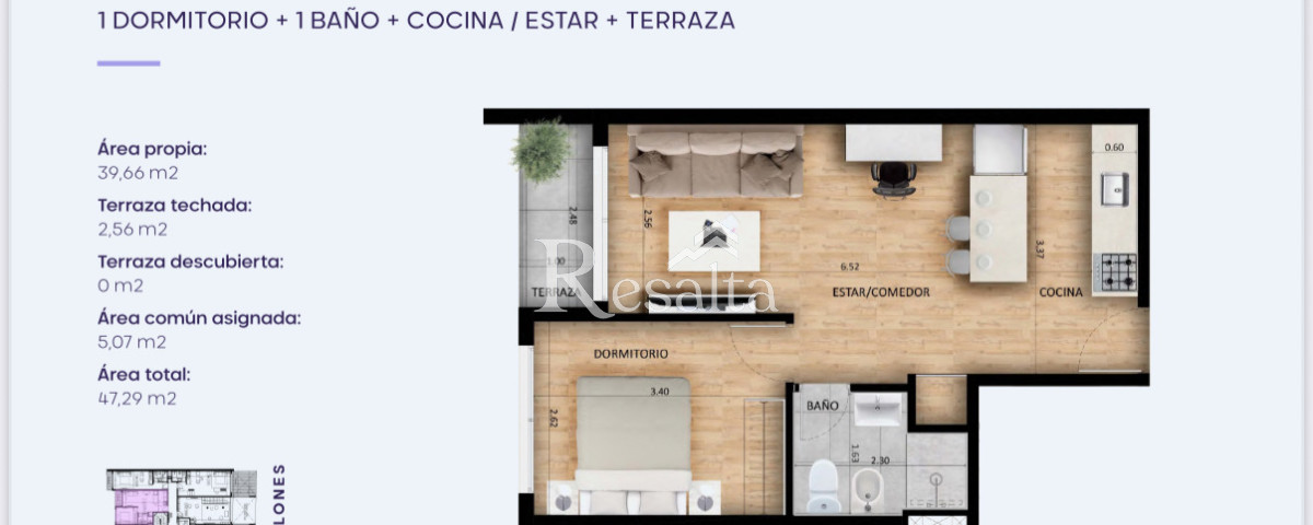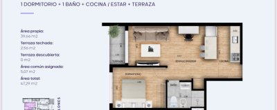 Este moderno apartamento ofrece 47,29 m² totales, distribuidos de manera funcional para aprovechar al máximo cada espacio. Cuenta con un área propia de 39,66 m², una terraza techada de 2,56 m² y un área común asignada de 5,07 m². El ambiente principal integra cocina, comedor y estar en un espacio amplio, luminoso y contemporáneo. El dormitorio es cómodo y cuenta con un baño completo de estilo moderno.